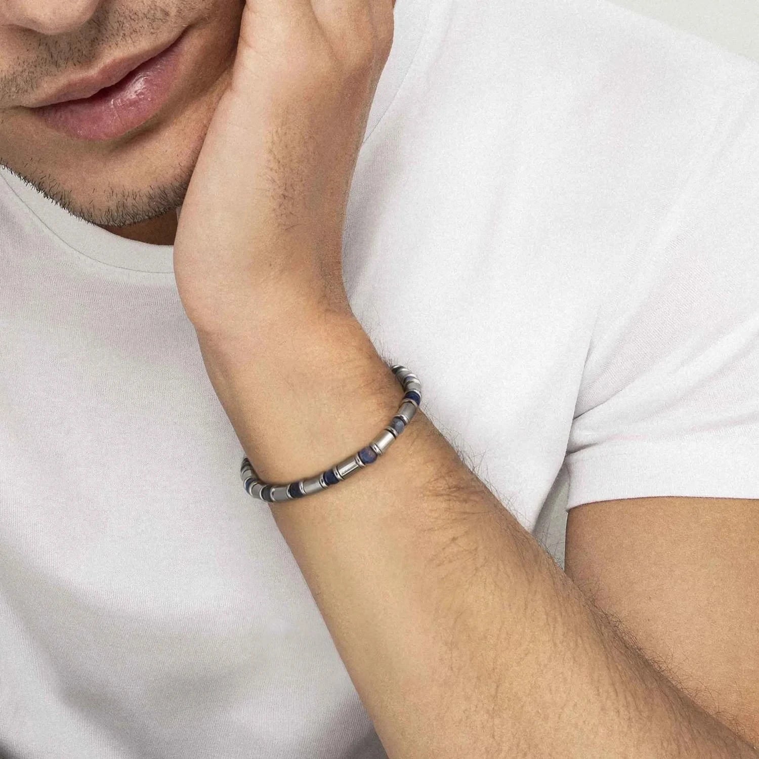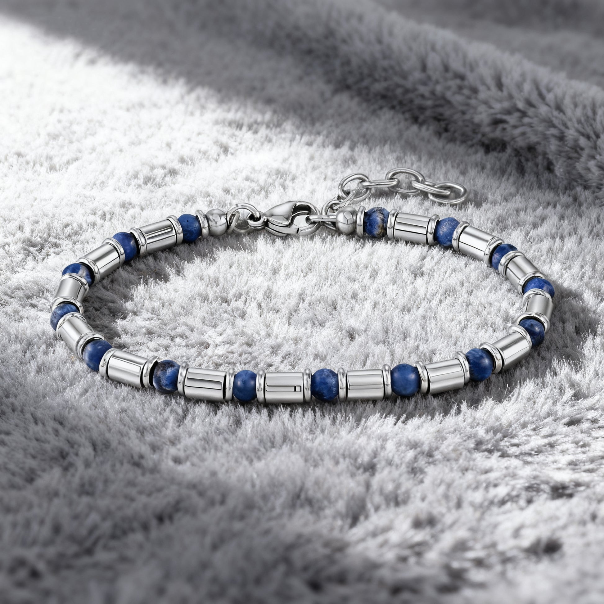 Earth Pulse is expertly crafted with 4mm natural blue stones, each separated by polished stainless steel cylindrical tubes and small spacers. The consistent pattern flows effortlessly around the wrist, offering a seamless and aesthetically pleasing design. Strung on a durable metal string, the bracelet is built for long-lasting wear and is finished with a secure stainless steel lobster clasp. The adjustable length (19cm to 22.5cm) ensures a comfortable fit for any wrist size, making this bracelet as versatile as it is stylish.